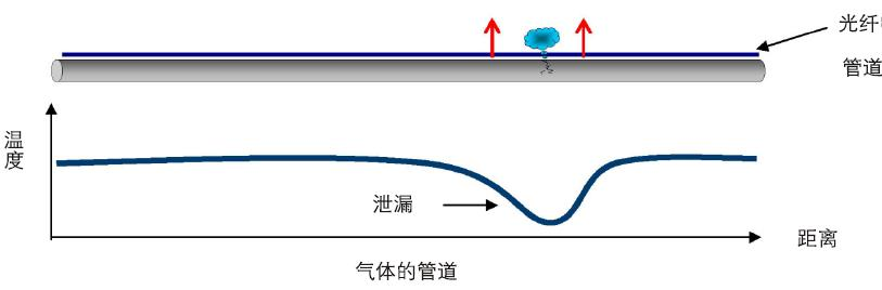 油氣管道泄漏時(shí)會(huì)引起泄漏點(diǎn)周?chē)鷾囟鹊淖兓?,通過(guò)分布式光纖溫度傳感系統(tǒng)可以準(zhǔn)確定位泄漏點(diǎn)。在天然氣管線(xiàn)介質(zhì)泄漏受壓情況下,氣態(tài)物質(zhì)導(dǎo)致的泄漏點(diǎn)的低溫,是由物質(zhì)的物理性質(zhì)、工藝條件和周?chē)h(huán)境所決定的。這些點(diǎn)的溫度異??赏ㄟ^(guò)分布式溫度測(cè)量而獲得,并有很好的溫度、距離和反應(yīng)時(shí)間精度。管道本身發(fā)生泄漏事故時(shí),泄漏出的天然氣由于存在壓力,會(huì)向管道周?chē)l(fā)出噴射狀的氣體。如果能對(duì)整條天然氣管道在現(xiàn)有的壓力、流量探測(cè)技術(shù)基礎(chǔ)上,利用沿管道敷設(shè)的通訊光纜,接入分布式光纖測(cè)溫傳感主機(jī),就能夠?qū)崟r(shí)探測(cè)到泄漏點(diǎn),并進(jìn)行泄漏點(diǎn)的定位和報(bào)警顯示。